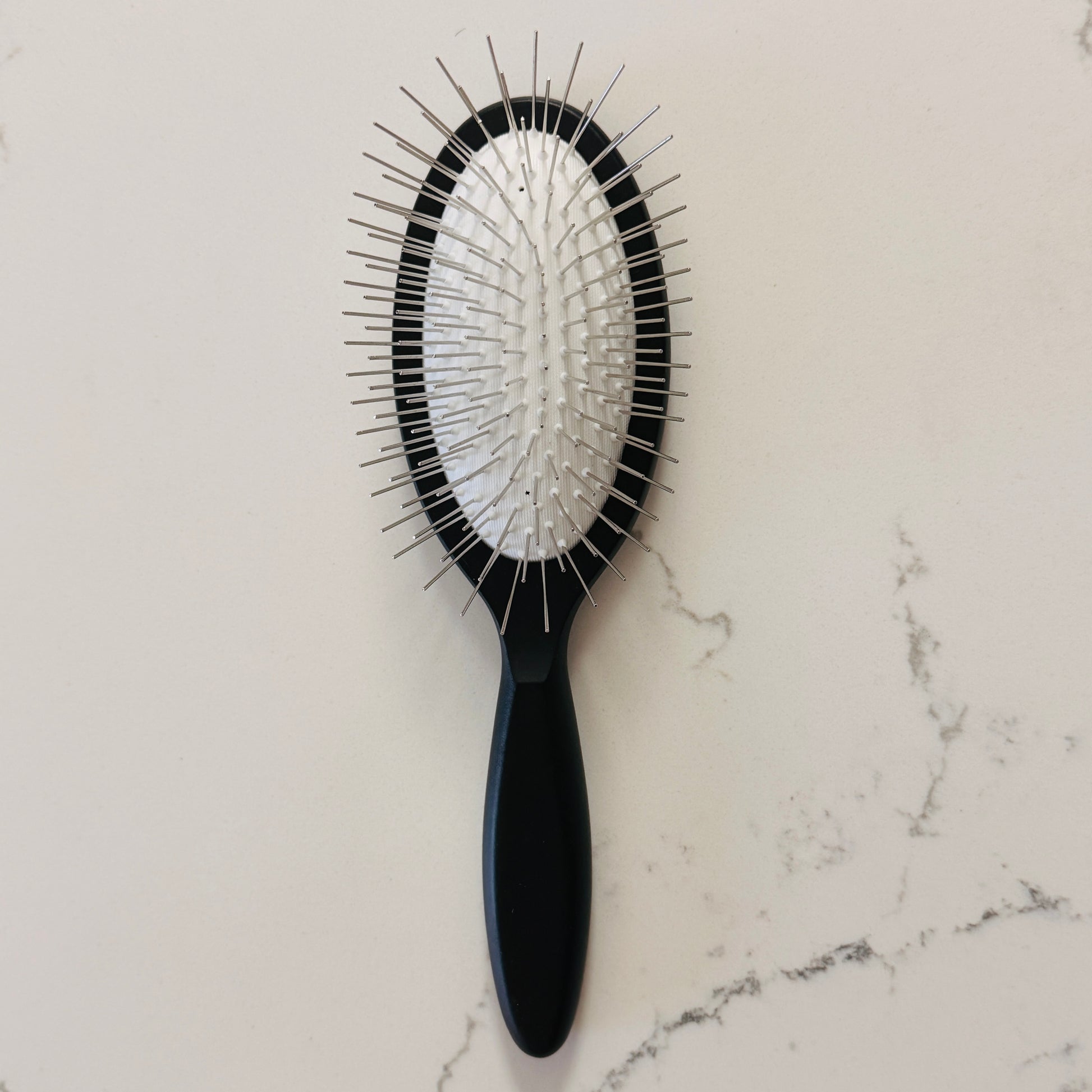 Medium oval cushion brush in black beech wood with a flexible base and 1.06″ steel pins. Size: 8.66″ × 2.48″
